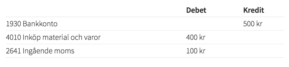 Du köper in material till din verksamhet för 500 kr och betalat via internetbanken. Ett av bokföringskontona som du använder är bankkontot. Bankkontot representeras ofta av bokföringskonto 1930 Bankkonto. Motkonto, det vill säga det andra bokföringskontot, är ofta bokföringskonto 4010 Inköp material och varor. Du brukar också ha 25 % moms som bokförs på 2641 Ingående moms.